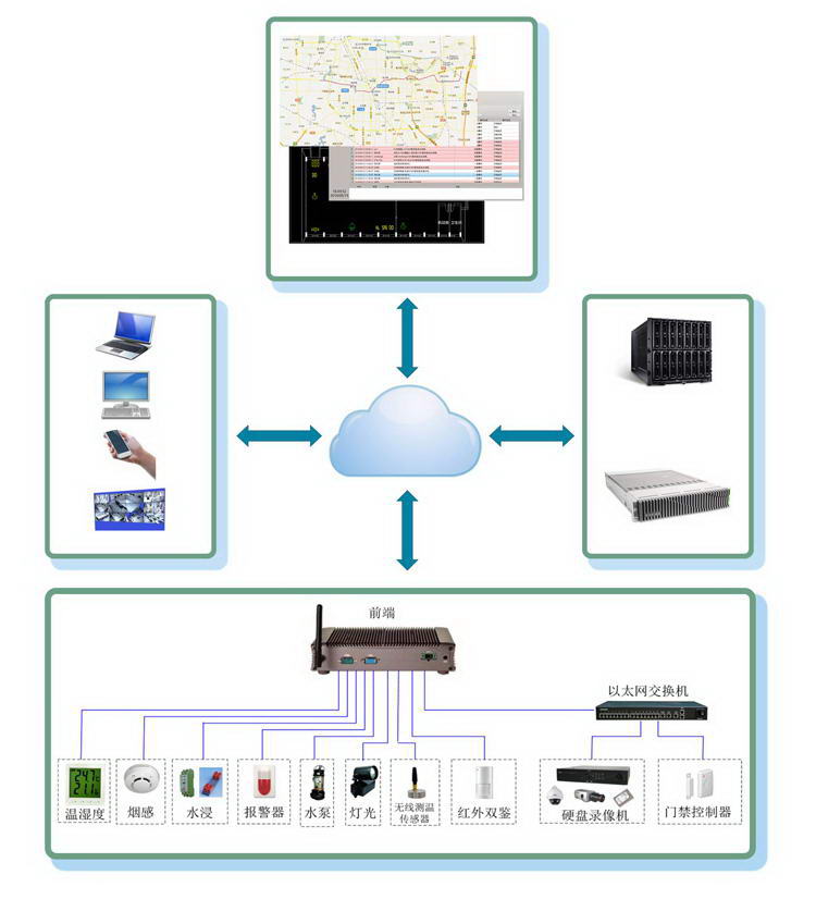 子系統(tǒng)主要包括:環(huán)境監(jiān)測系統(tǒng)、無線設(shè)備測溫系統(tǒng)、煙火監(jiān)測系統(tǒng)、門磁監(jiān)測系統(tǒng)、入侵監(jiān)測系統(tǒng)、水浸監(jiān)測系統(tǒng)、視頻監(jiān)控系統(tǒng)。